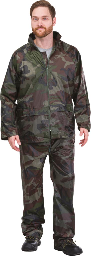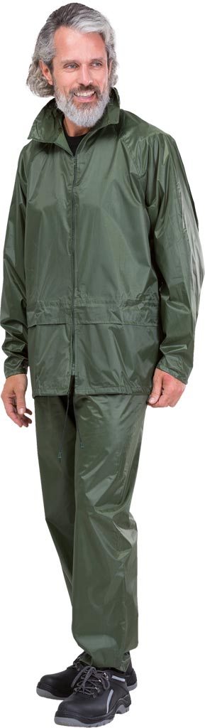 Komplet przeciwdeszczowy w skład którego wchodzą spodnie do pasa i kurtka, tkany.